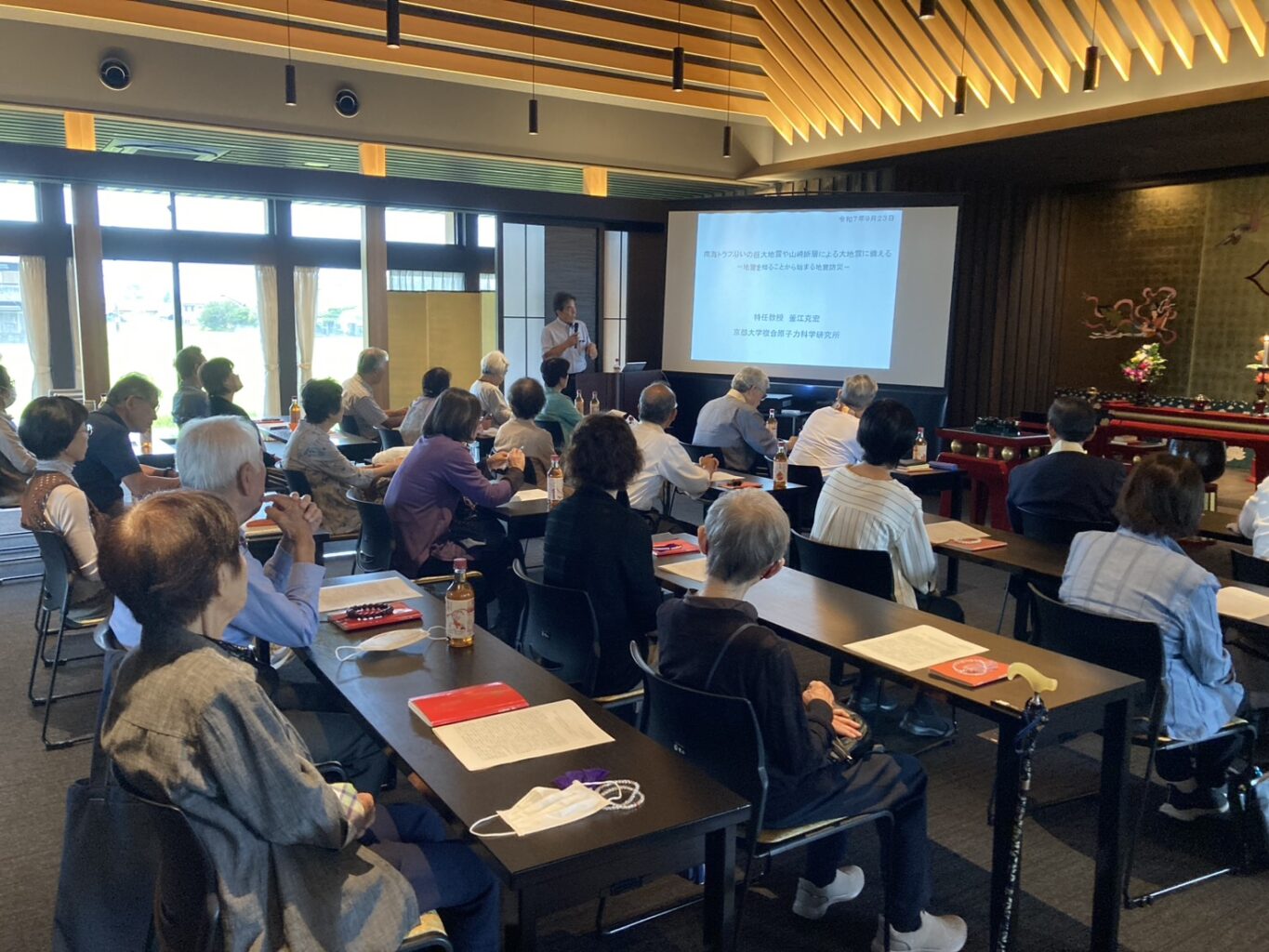 みんなで正信偈を唱和した後、上記台で講演をしていただきました。資料・プロジェクターを使用し、内陸地殻内地震とプレート境界地震の違いや、なぜ東南海、南海地震が切迫しているのか、地震災害軽減に向けて私たちが取るべき行動についてお話を聞かせていただきました。